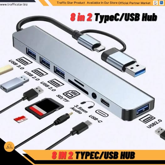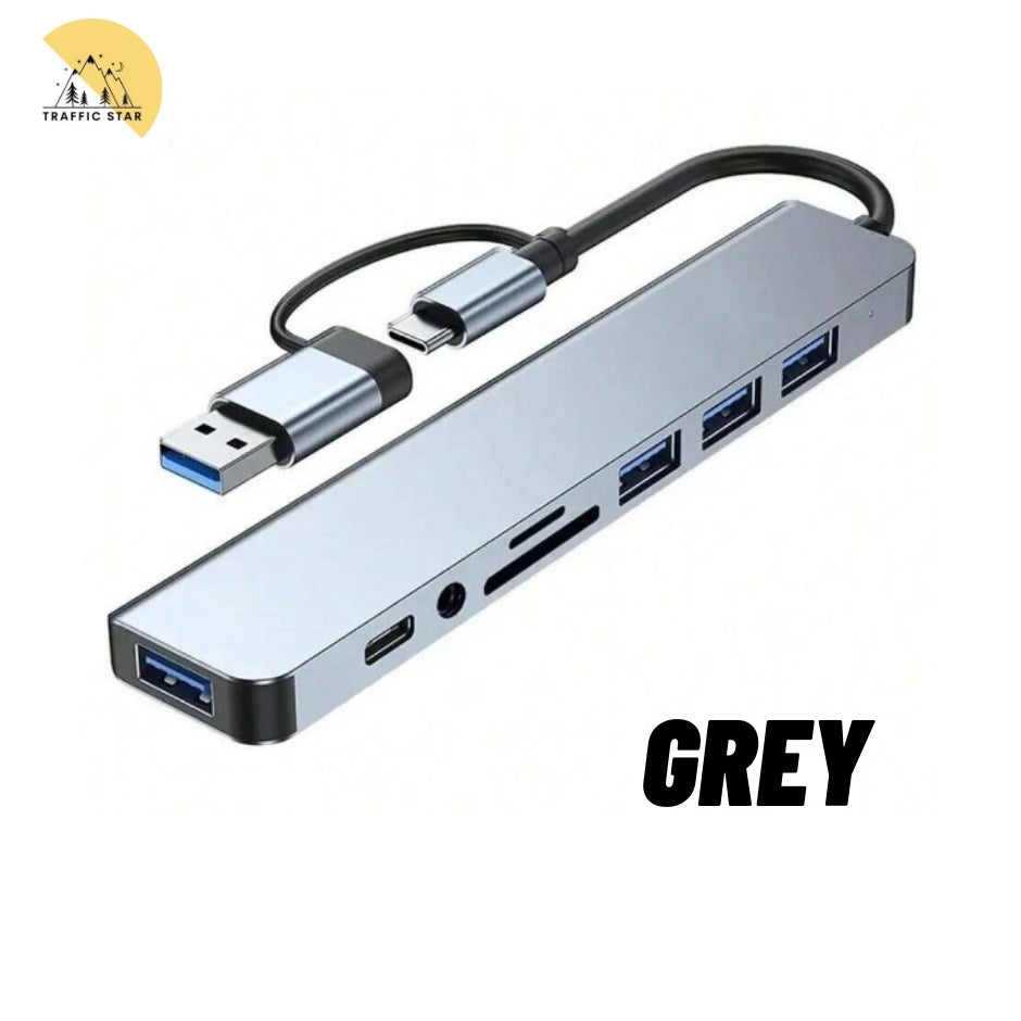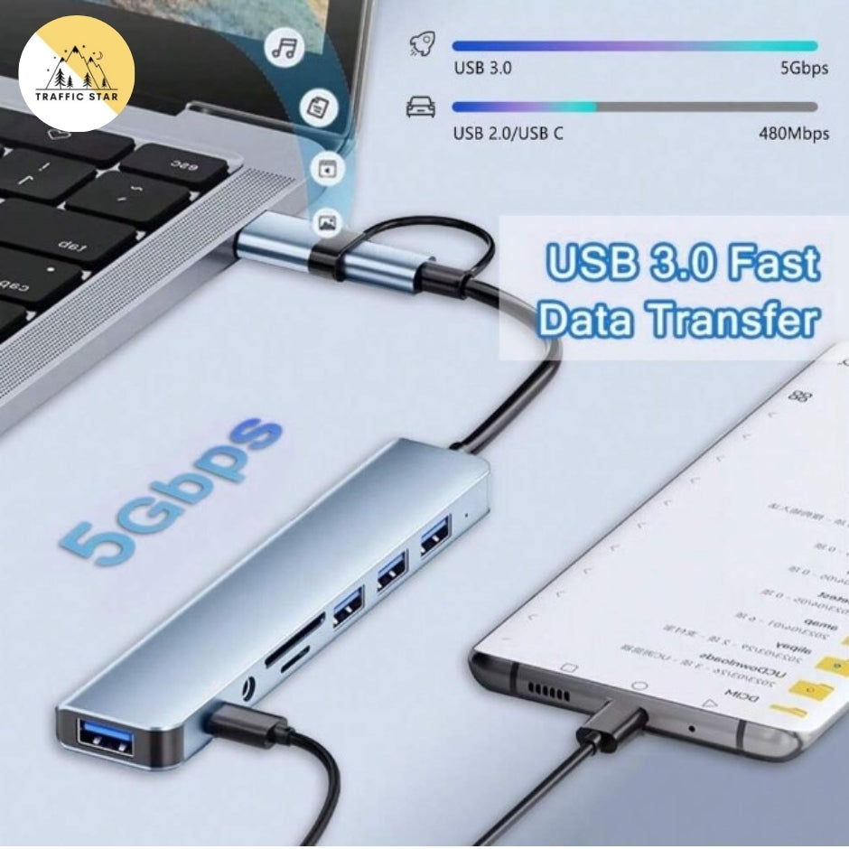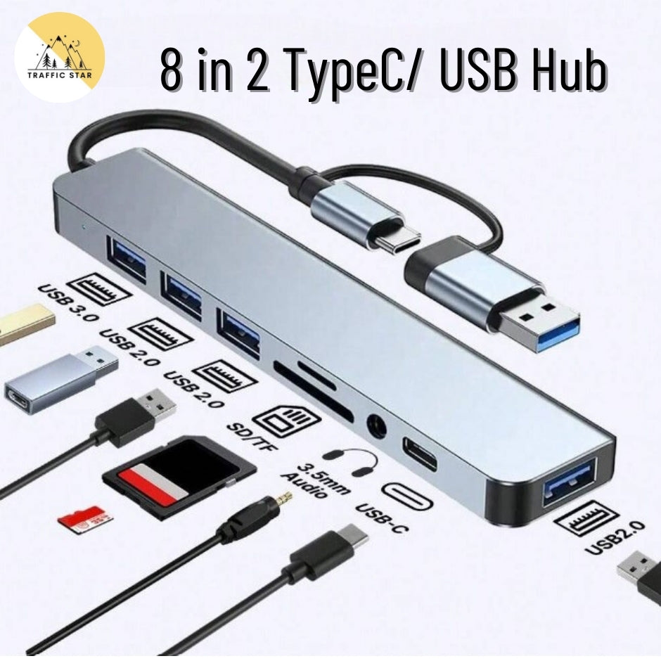 8 in 2 USB Hub with Splitter Card Reader, USB C Port, USB 3.0/2.0, SD/TF Splitter Card Reader, Mobile Phone Docking Station