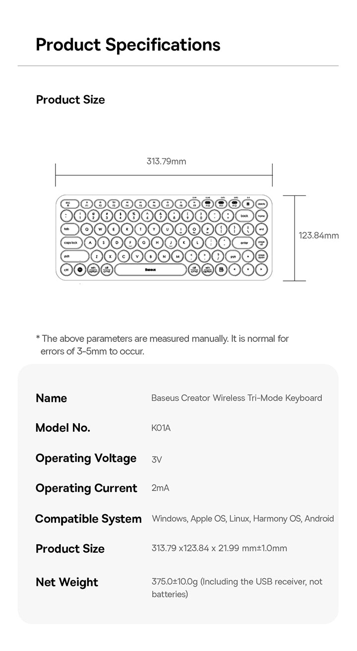 Baseus K01A Bluetooth 5.0 + 2.4G Wireless Keyboard USB Silent US Layout Creator Keyboard 84 keys