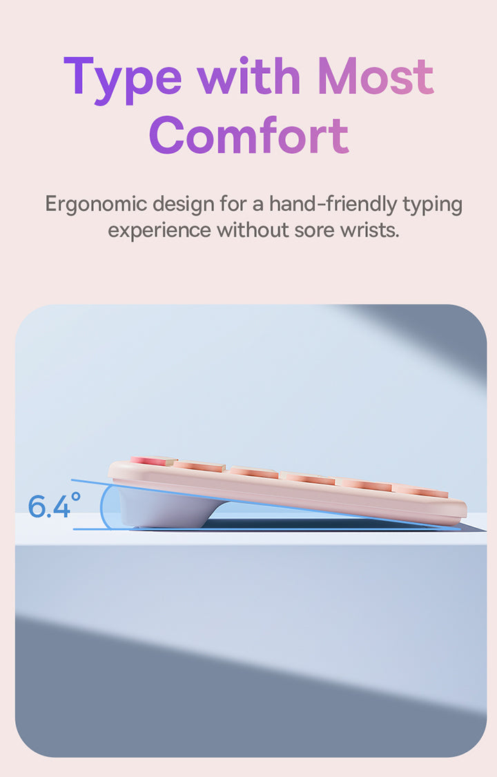 A gentle 6.4° tilt provides a natural hand position, making extended typing comfortable and reducing wrist strain.
