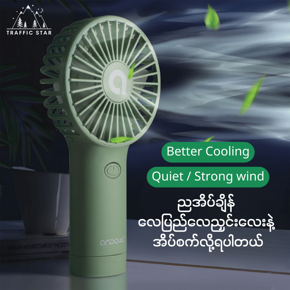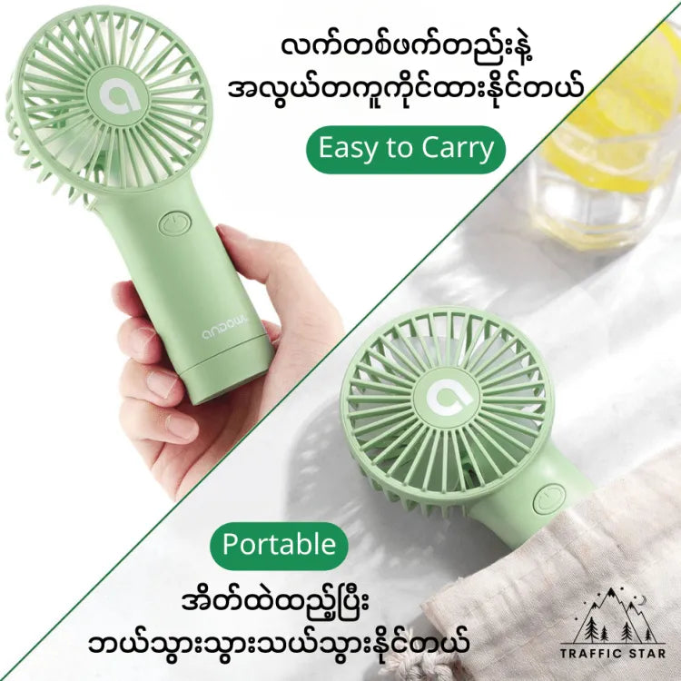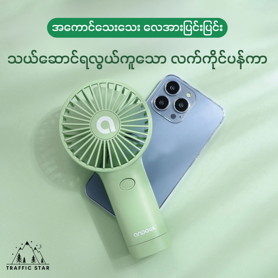 - ဘယ်သွားသွားအလွယ်တကူသယ်ဆောင်သွားနိုင်သော လက်ကိုင်ပန်ကာ