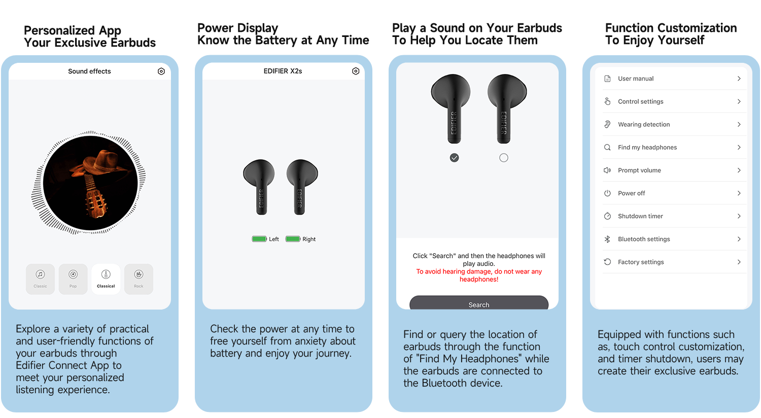 Edifier Acoustics Laboratory selected titanized composite diaphragm to improve sound quality and create richer and more delicate sounds. Featuring surging bass and crystal-clear mid-range and treble, the earbuds present CD-level original sounds.