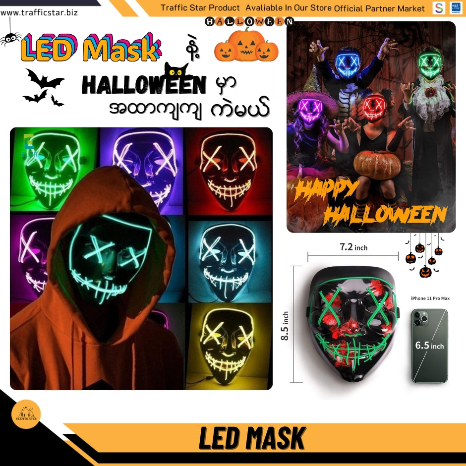 - Halloween LED glowing scary mask. The mask has an LED light strip, uses two AA batteries, connects the buckle, presses the button a button, the 4 modes (off, constant on, slow flicker, fast flicker) and continues to use for more than 24 hours. Let the face mask light up your Halloween! (The battery is not included).