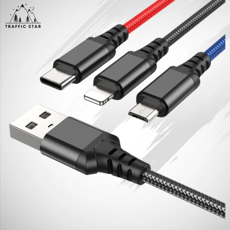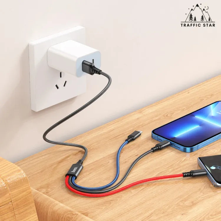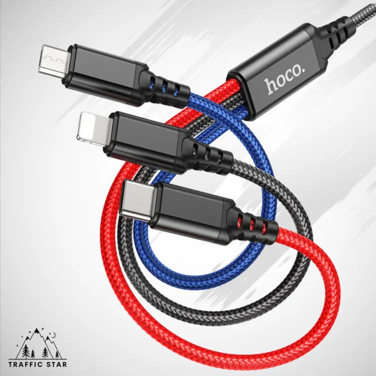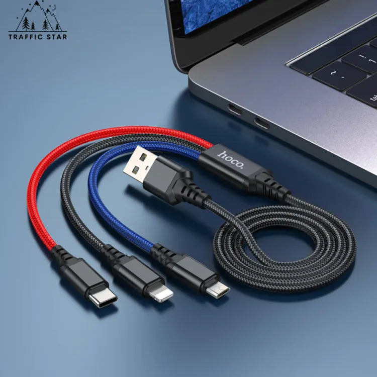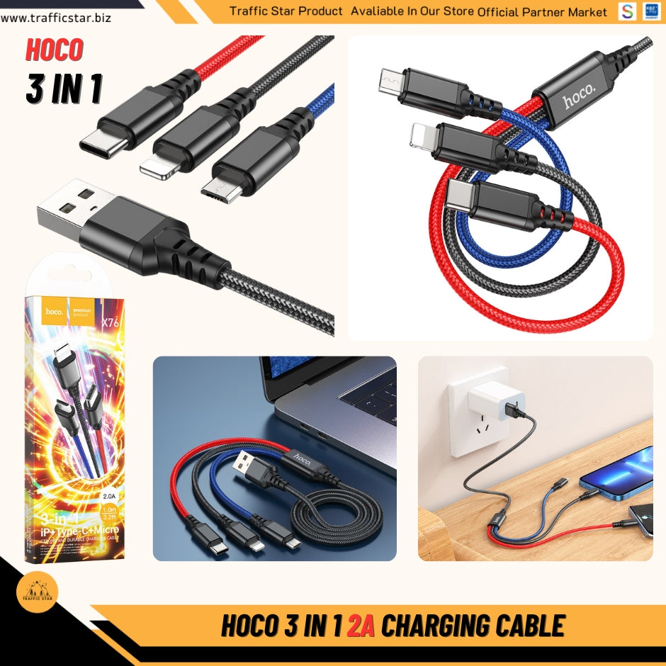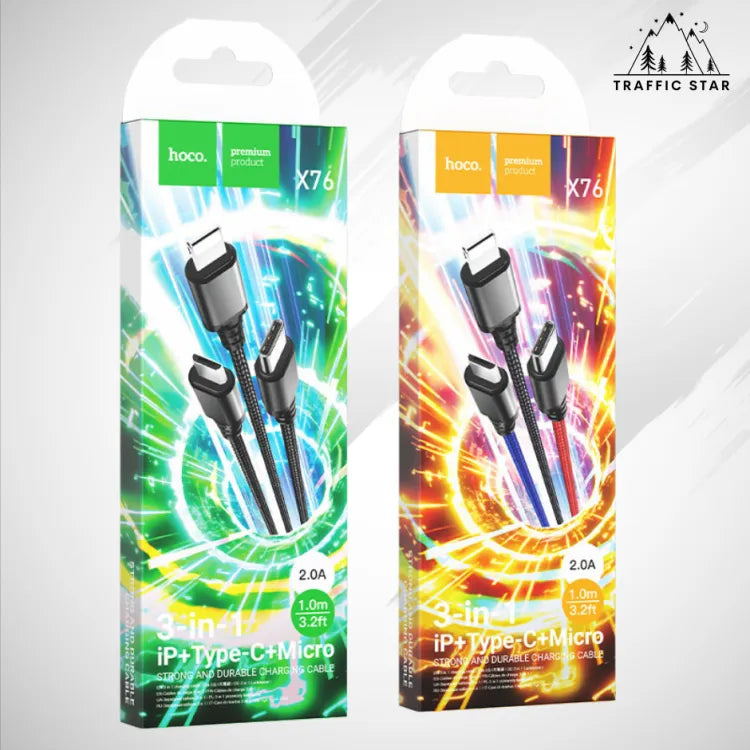 Hoco X76 Charging Cable 3in1 2A 1M Comes with 3 heads for i/Micro/Type-C, easy to use, fast charging, genuine nylon braided cable, high quality Charging Cable