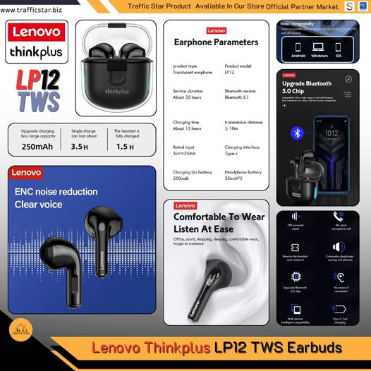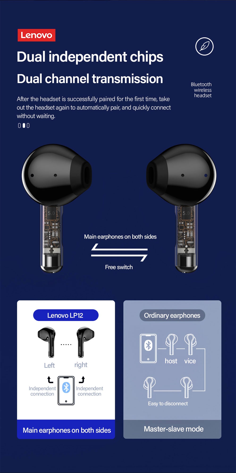 Lenovo LP12 Bluetooth Wireless HIFI Stereo Sound TWS Earbuds